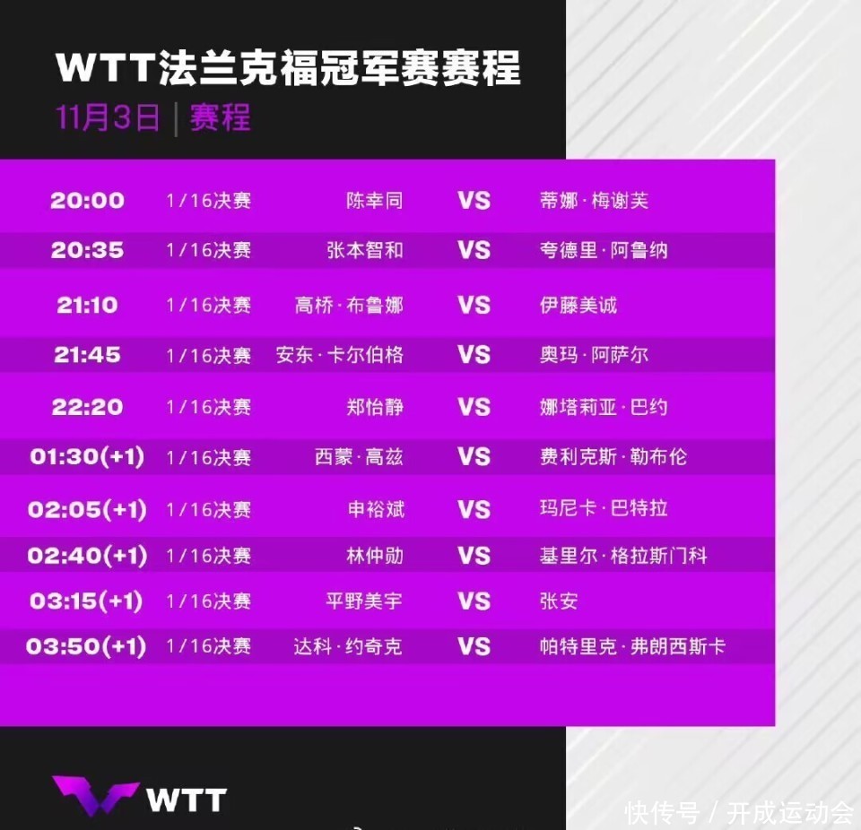 WTT法兰克福冠军赛首日赛程+11月3日直播表:张本智和VS非洲一哥